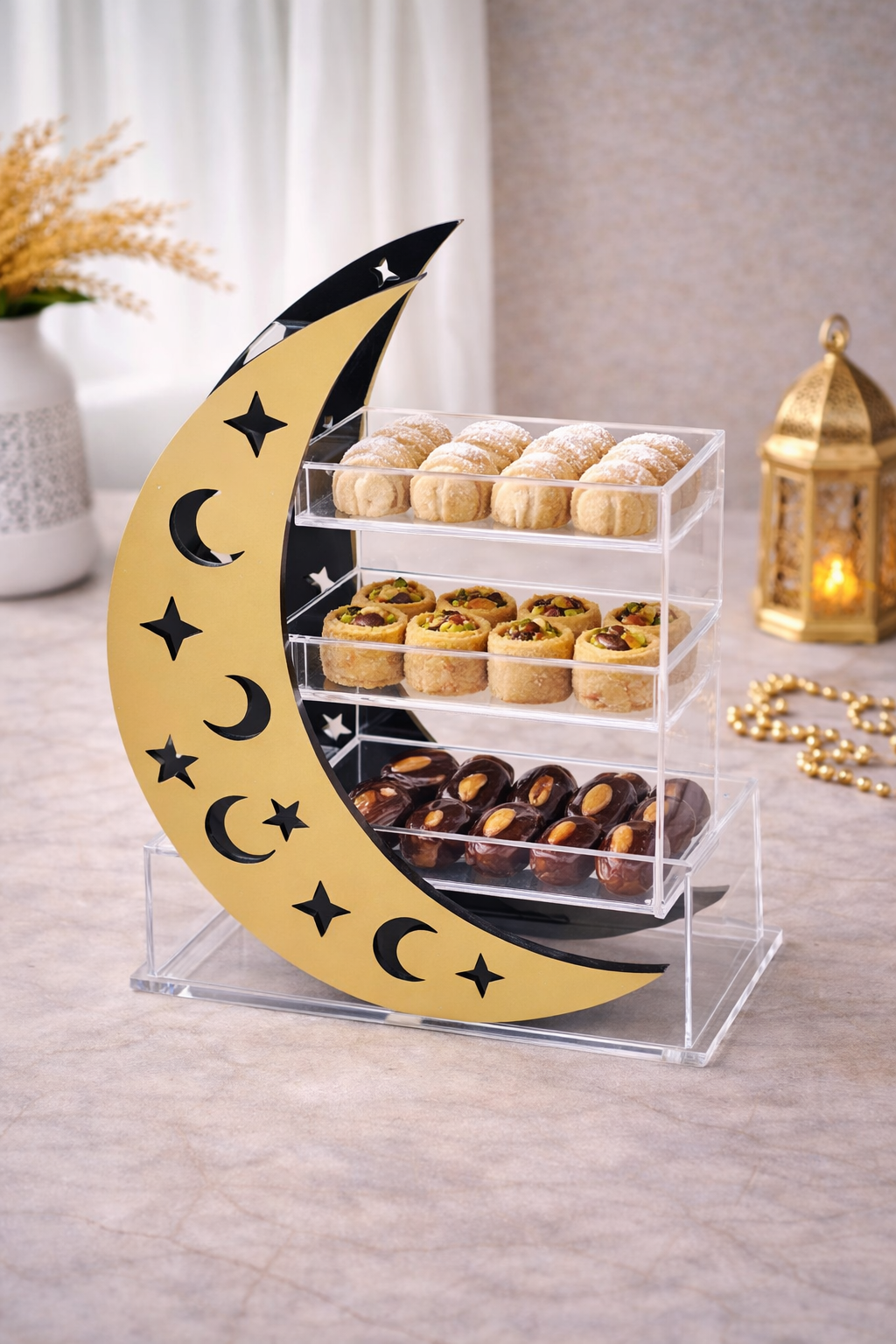 Category: Ramadan Tags: ارتفاع الهلال 41 cm, هلال رمضان اكريليك ذهبي و شفاف مع ٣ علب